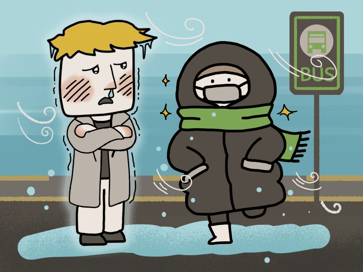 But Korea's winter has ☕knife winds (= biting winds) blowing from the Siberian Air Mass, causing ☕sensible temperatures (= wind chill) to drop to minus 20 degrees Celsius. For Koreans, who rely heavily on public transportation, long padded coats are not simply fashion items but a “shield” and “armor” that protect the body from ☕the bone-cutting cold (=the biting cold). It’s not that they have given up on style, but about making a practical choice to ☕survive (= endure) a harsh winter.